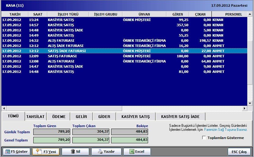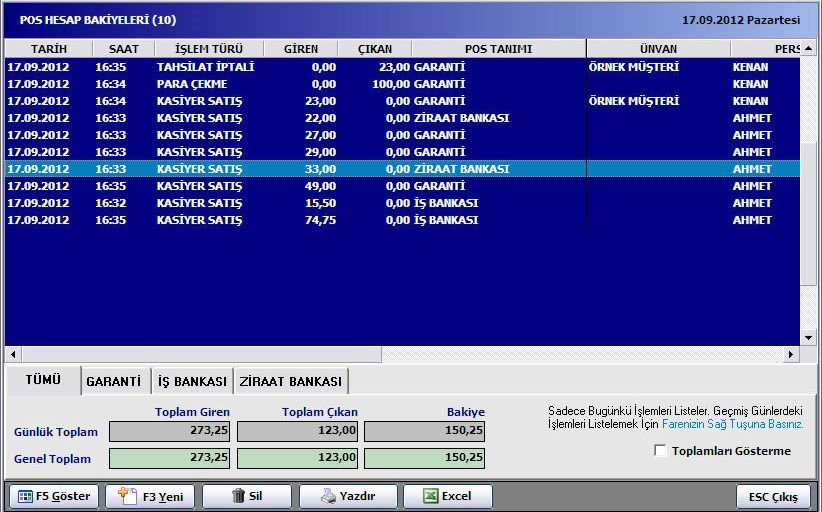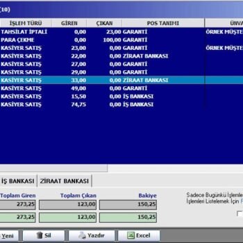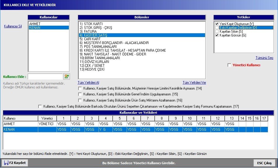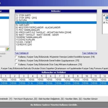 - Eğer istenirse her kullanıcı şifre ile programa girebilir ve kullanıcının yaptığı satışlar takip edilebilir. Kullanıcının yetkileri sınırlandırılabilir. Örneğin Ahmet kullanıcısının kasa kayıtlarını düzeltmesi veya silmesi engellenebilir. Vardiyalı çalışan işletmeler de bu bölüm aracılığı ile vardiya takibi yapabilirler.