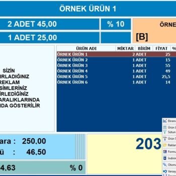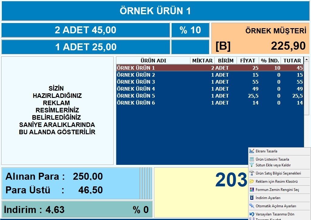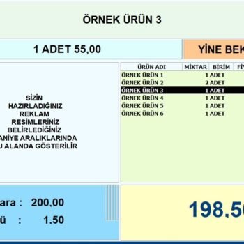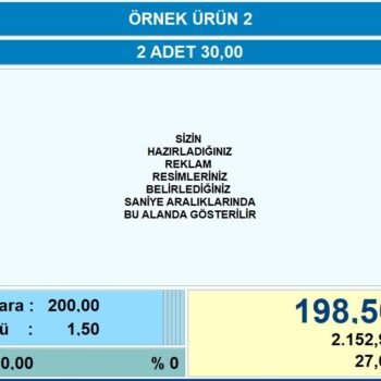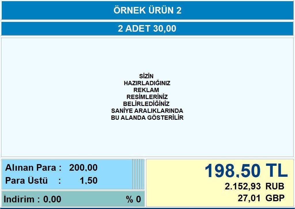 - Müşteri Ekranı modülü yardımıyla “Kasiyer Satış” ekranındaki istediğiniz bazı bilgileri bilgisayarınızdaki 2. monitöre aktarabilirsiniz. İsterseniz işletmenize ait reklam resimlerini belirlediğiniz saniye aralıklarında gösterebilirsiniz. Bu ekranın birçok özelliğini değiştirebilirsiniz. Detaylı bilgi için Sistem kurucusundan destek alın.
